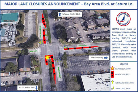 CLCWA must make an emergency repair on Bay Area Blvd. at Saturn Ln. starting March 15 and estimated to be completed on March 27.
